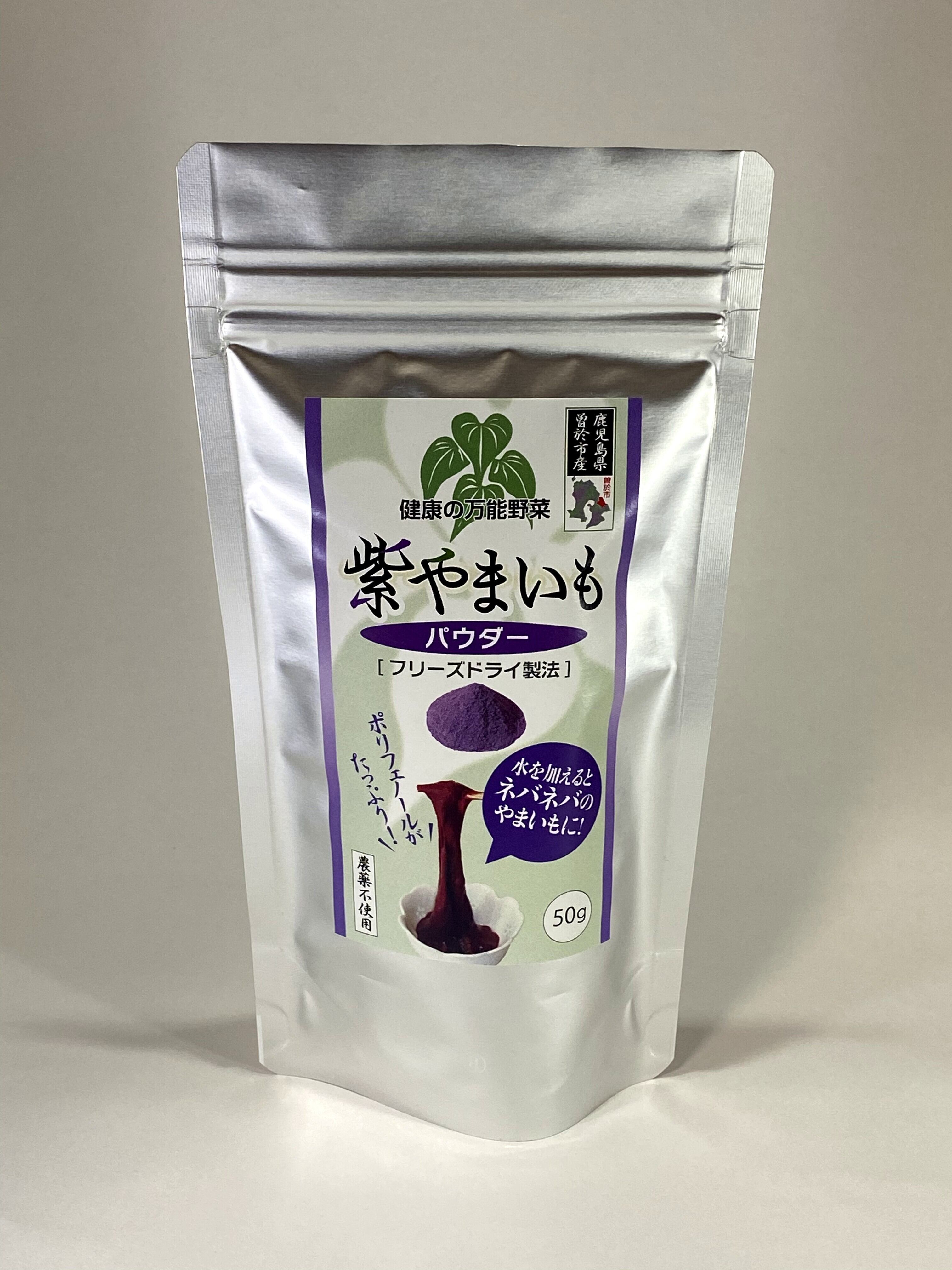 やまいもの皮むきは大変ですよね。その大変な作業をなくし簡単に食べれるようにパウダー化したものです。フリーズドライ製法という特殊な方法で精製されており、安心、安全に食べていただけます。特徴的なこの紫色は、20年の歳月をかけて当店が開発したもので、他社より色鮮やかで濃いものとなっています。使用法は、このパウダーに水を混ぜるだけで粘り気のある紫色のやまいもになります。その他に、お好み焼きやお蕎麦、お菓子などへ使用されてみて下さい。